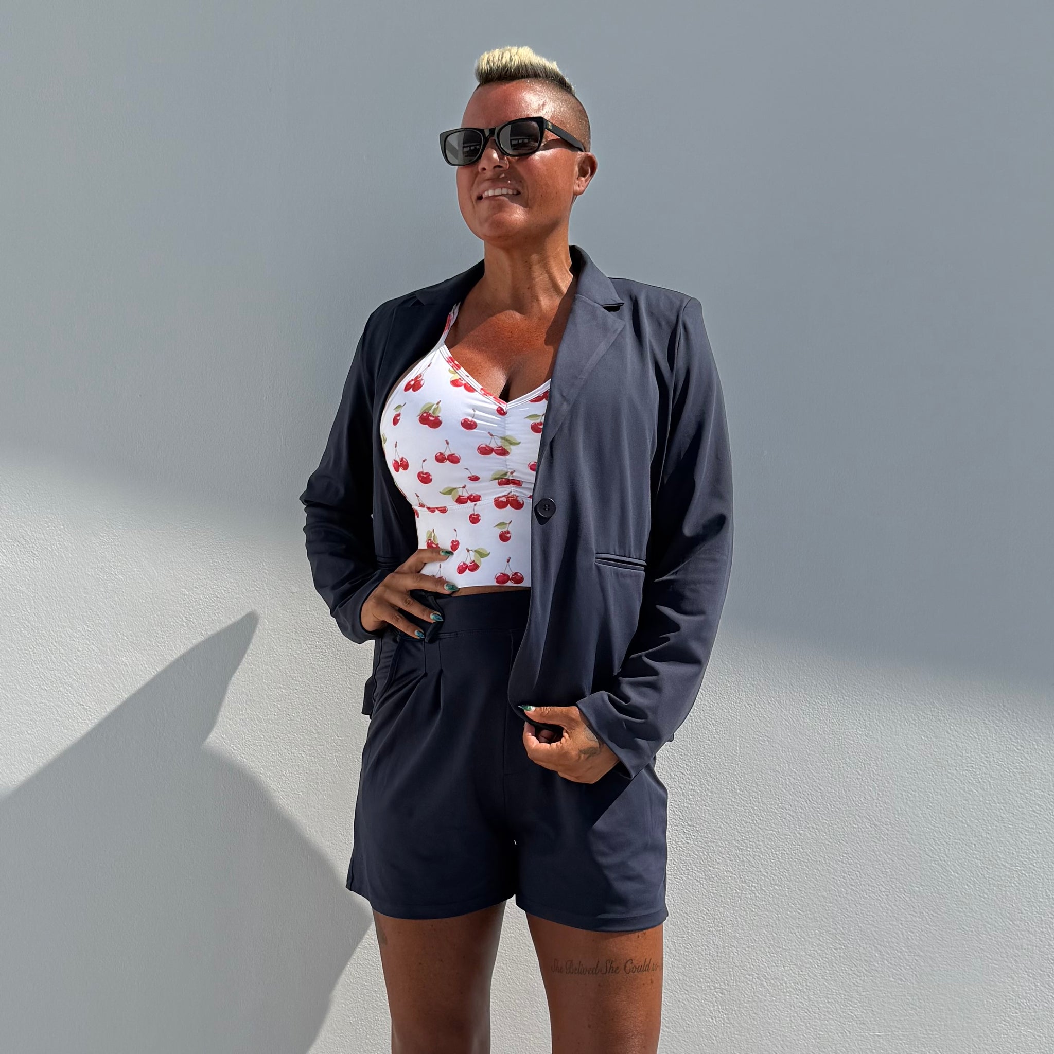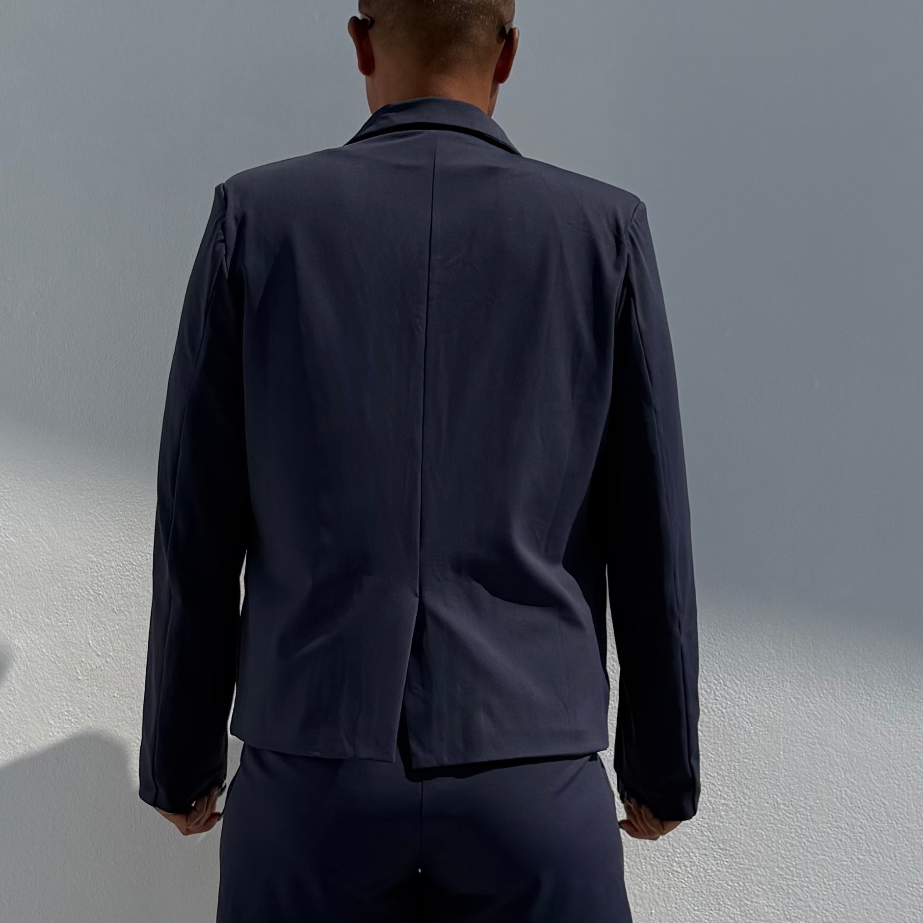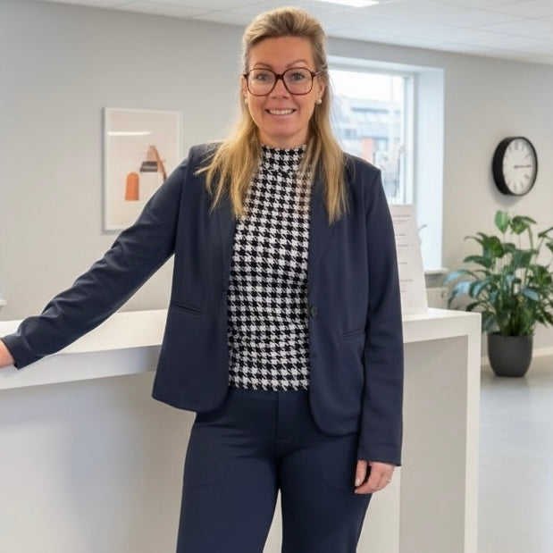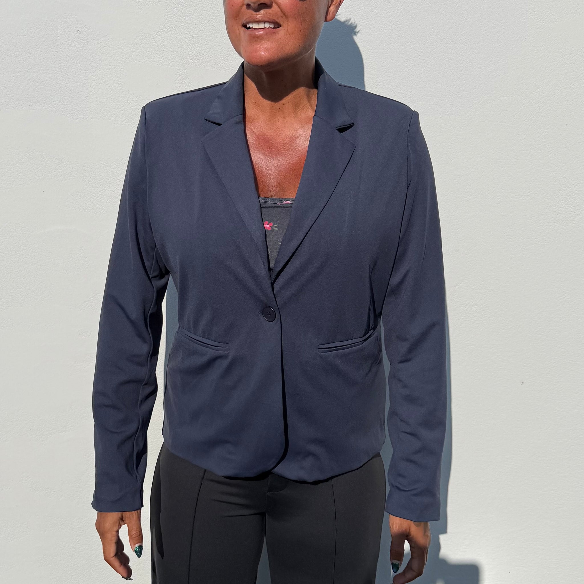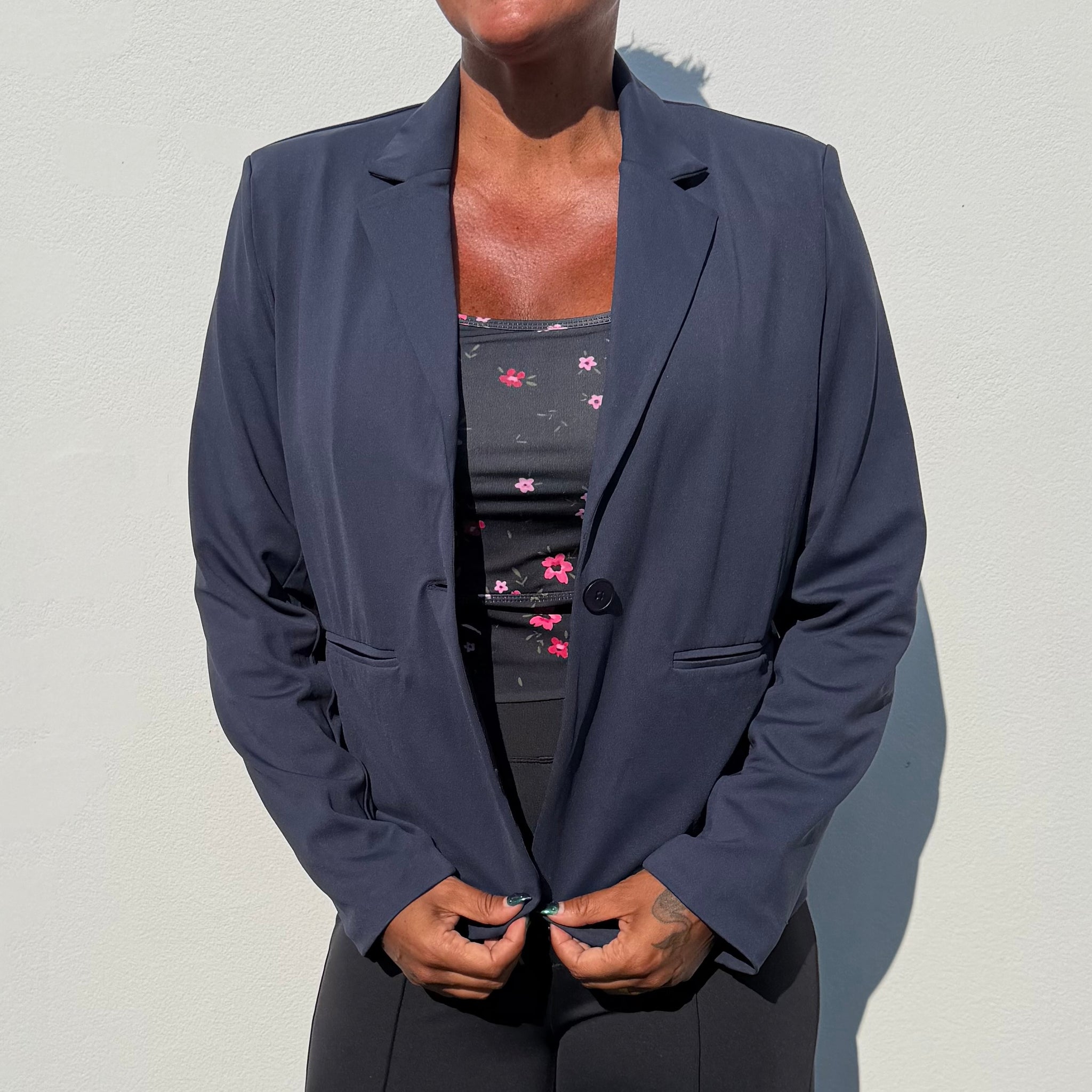 Mörkblå enkelknäppt kavaj med fickor fram. Skapad i vårt elastiska tyg passar den lika bra till vardags och fest och är perfekt att matcha med våra kjolar och byxor. Passformen är något snäv, så är du mellan två storlekar rekommenderar vi en storlek större.