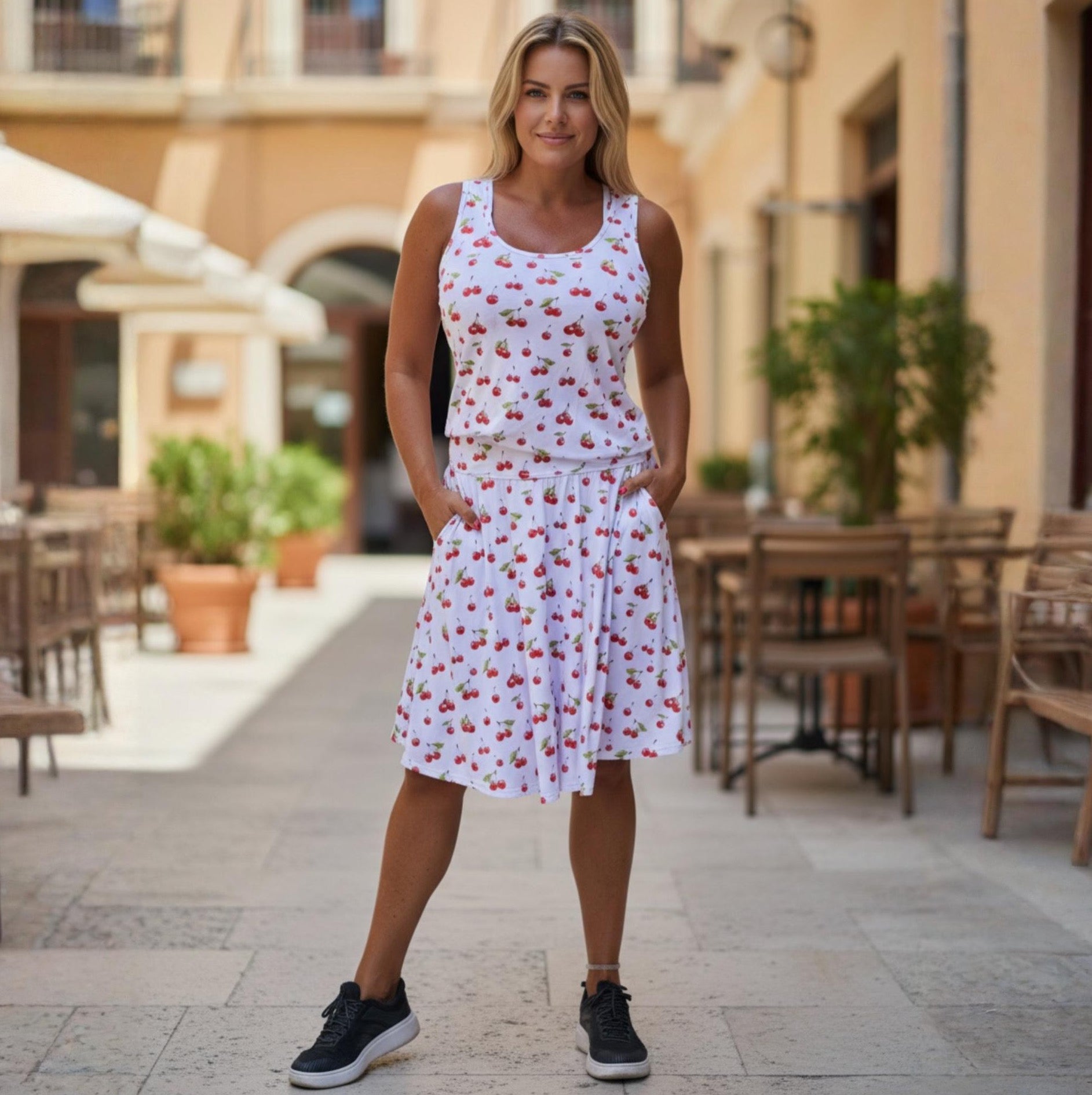 Valkoinen polvipituinen kirsikkakuvioinen laskostettu hame ohuemmasta kankaasta, joka laskeutuu uskomattoman kauniisti. Luotu mukavaan arkikäyttöön ja aktiiviseen elämäntyyliin. Tässä hameessa on kaksi tavallista käsitaskua ulkopuolella avainten, matkapuhelimen ja esimerkiksi pallojen ja muiden golftarvikkeiden säilyttämistä varten. Siinä on korkea vyötärö ja kaksi matkapuhelintaskua sisäshortseissa. Sisäshortsien kokoa on päivitetty paremman istuvuuden takaamiseksi. Hame on luotu aktiiviseen elämäntyyliin ja sopii yhtä lailla arkeen, golfiin kuin juhliinkin.