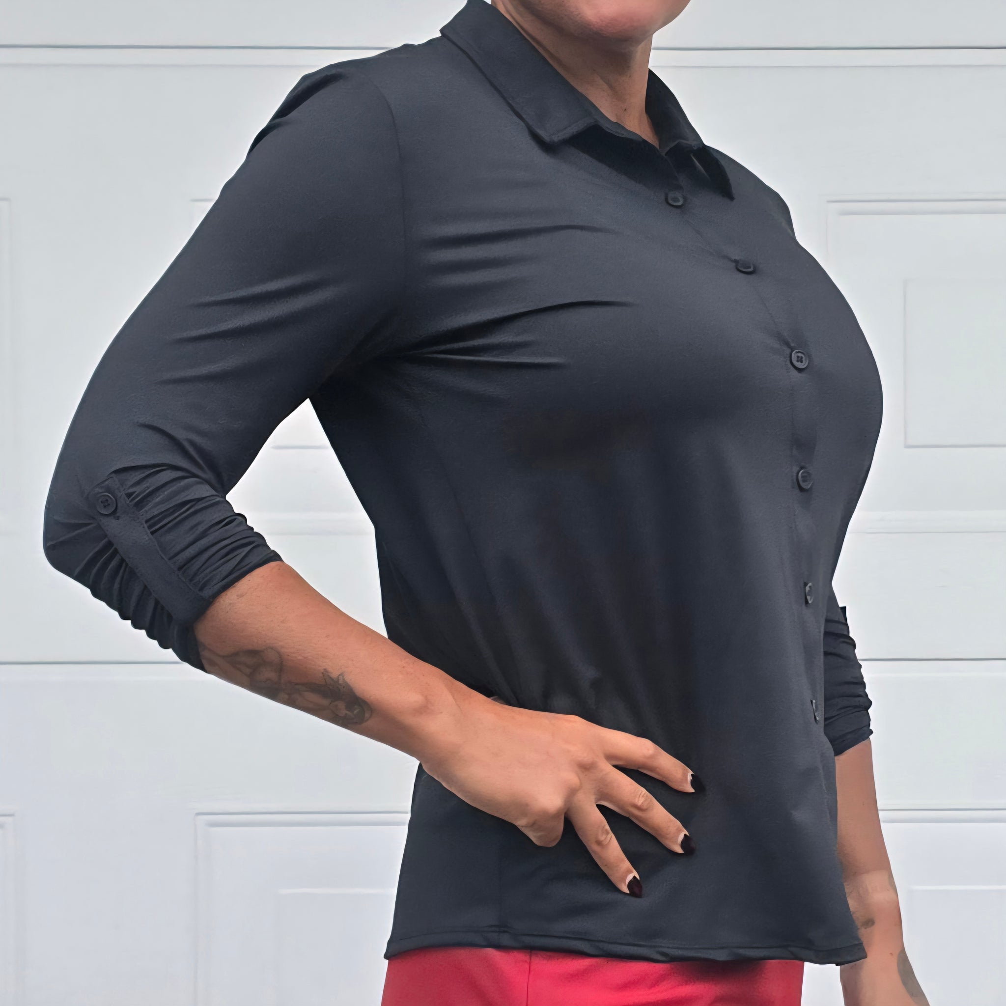 Snygg svart blus i vårt sköna mjuka och elastiska material. Smart knapp om du vill rulla upp underärmarna. Formad nedtill så passar lika bra att bära utanpå byxor/kjol som att stoppa in. Något liten i storlek, så vi rekommenderar att välja en storlek större.