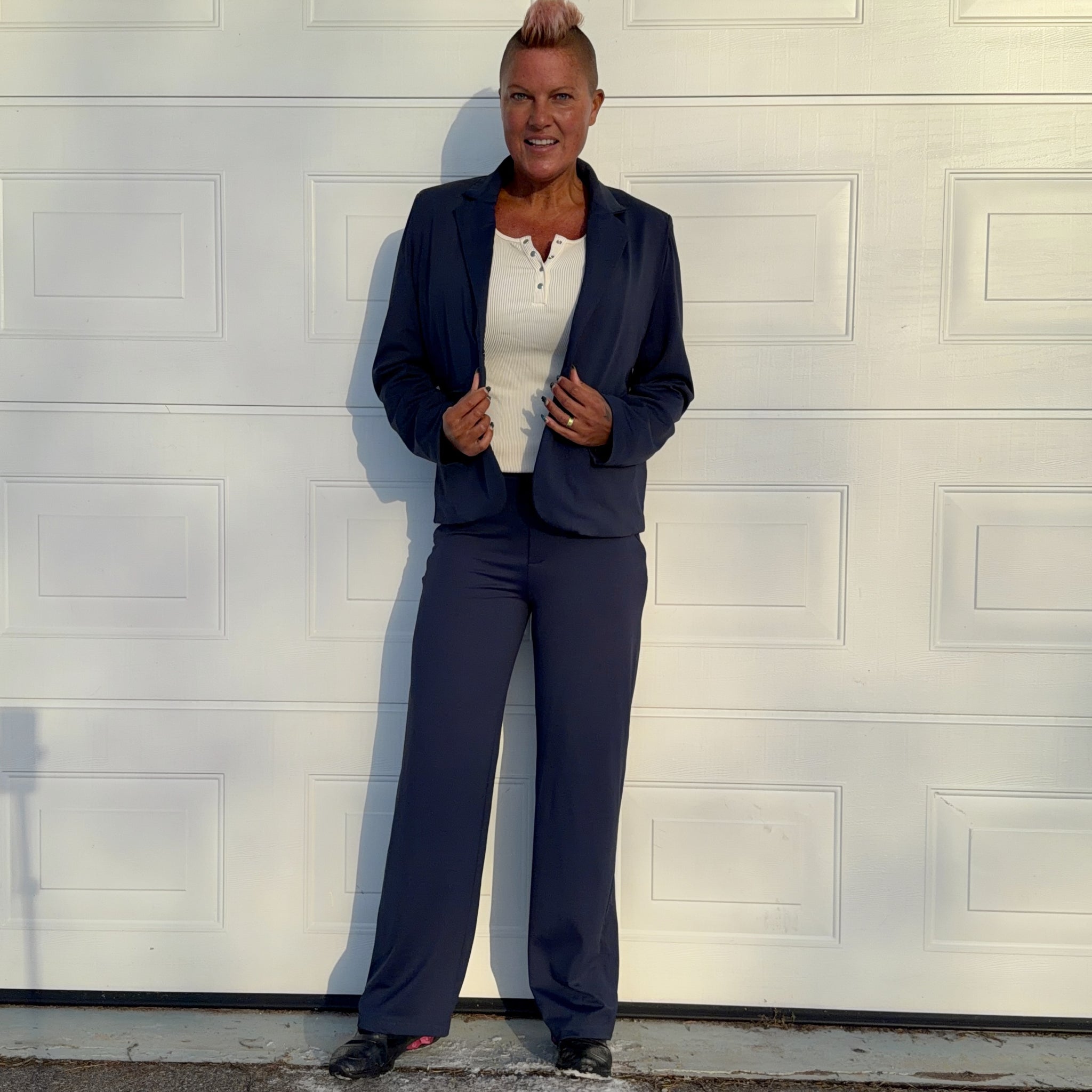 Lyxiga mörkblå byxor med raka ben och ledig passform. Ser ut som kostymbyxor, men känns som mjukisbyxor. Tillverkade i vår vanliga sköna polyesterblandning. Praktiska fickor med diskreta blixtlås på vardera ben. Extra hög midja med bälteshållare. Passar en aktiv livsstil och även perfekt för golfbanan. Innerbenslängden på dessa byxor är "Korta": 70 cm / 27,5 tum i alla storlekar. Samma byxa finns också i "regular" längd HÄR samt i "Lång" variant HÄR. Storlekarna är "normala", så välj den storlek du oftast använder på "vanliga" vardagsbyxor. Se storleksguiden för byxorna bland produktbilderna. Du hittar även storlekstabellen HÄR (kom ihåg att kolla att tabellen specifikt gäller för byxor - inte underdelar).